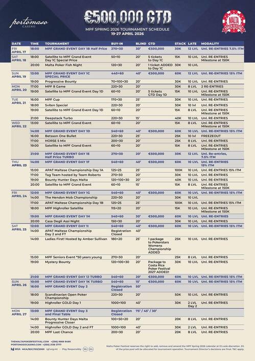 The Malta Poker Festival takes place at Portomaso Casino from April 19 to 27, 2026.