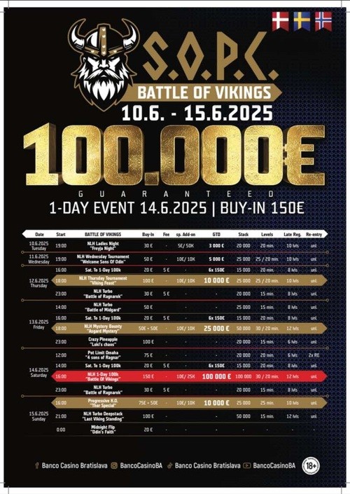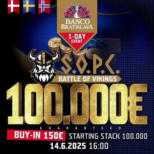 Vi er igen klar til at holde en stor poker fest for alle pokerglade skandinaver på Banco Casino i hjertet af Bratislava. Denne gang har vi lavet lidt om på turneringsprogrammet så vi kan sende endnu flere hjem med pokaler og en masse Euro !!! Scandinavian Open Poker Championship byder på en masse en-dags events med lave buy-in og høje GTD !! Der vil være en masse varianter, lige fra Mystery Bounty til Crazy Pineapple. Alt dette krydret med en masse Cash Game og tid til at være social med dine poker-buddies .